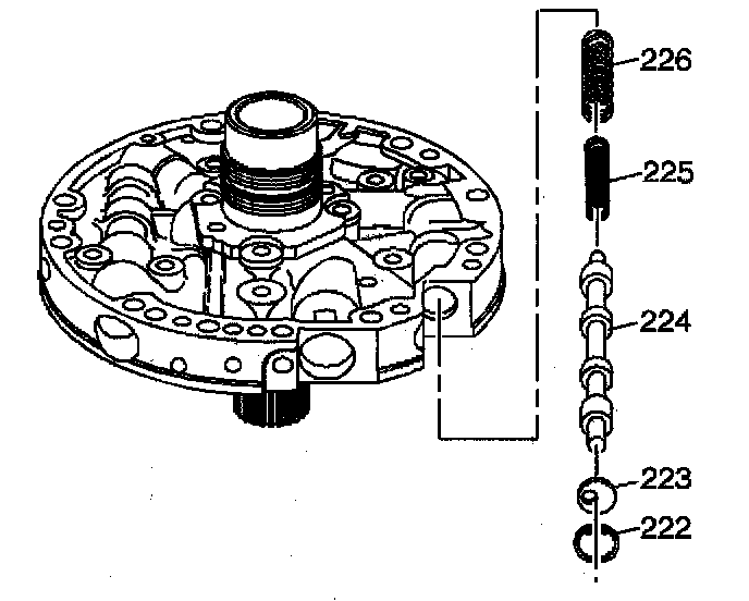 10. Install the stop valve (223) and the oil pump converter clutch valve retaining ring (222).