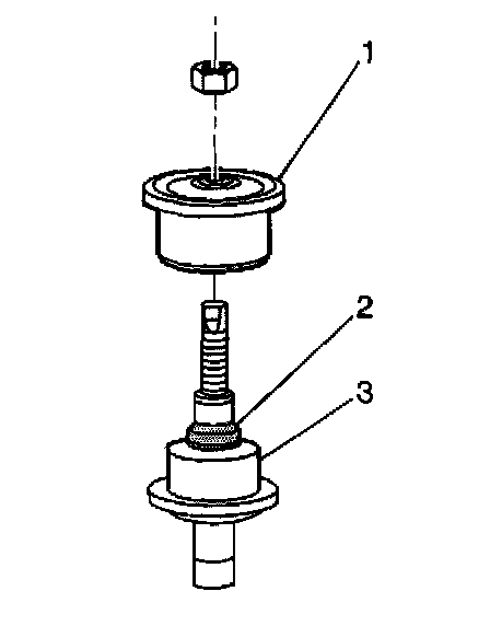 Important: The upper insulators are substantially larger that the lower insulators. The upper insulator (1) must be installed above the shock mounting bracket on the frame. The plastic pilot ring (2) will assist the alignment of the isolators.