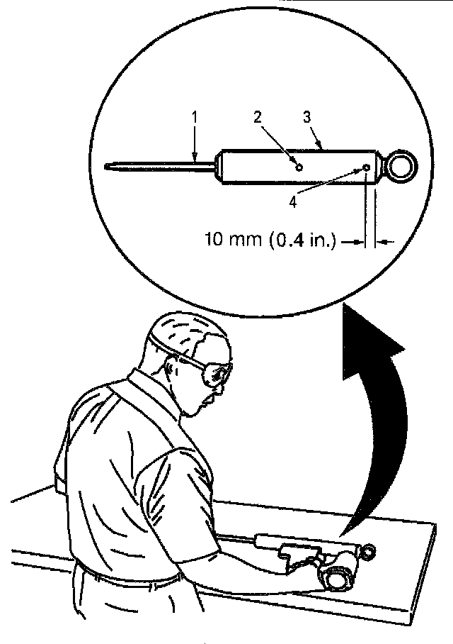 3. Drill a hole in the shock absorber at the centerpunch (4) using a 5 mm (3/16 inch) drill bit. Gas or a gas/oil mixture will exhaust when the drill bit penetrates the shock absorber. Use shop towels in order to contain the escaping oil.