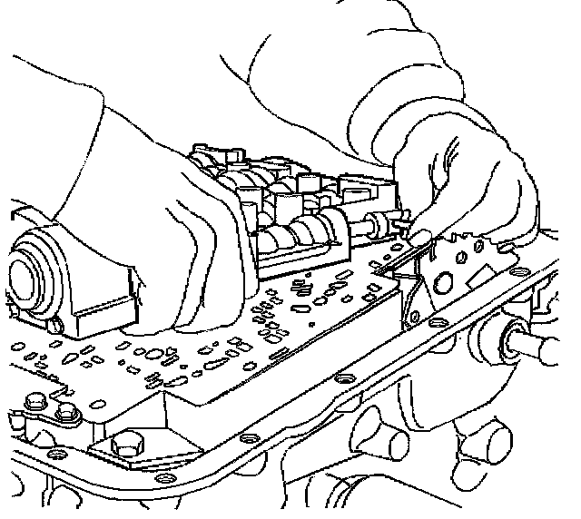 2. Install the valve body over the J25025-5 Guide Pins, and connect the manual valve link to the manual valve.