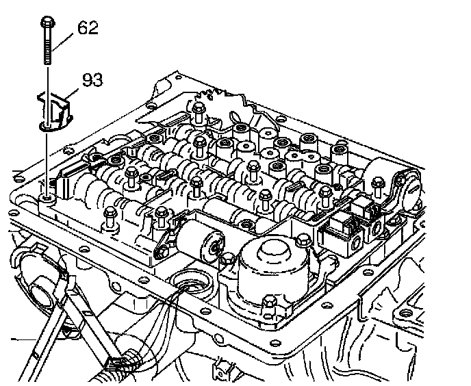 5. Install the fluid level indicator stop bracket (93) and the valve body bolts (62) that are shown only.