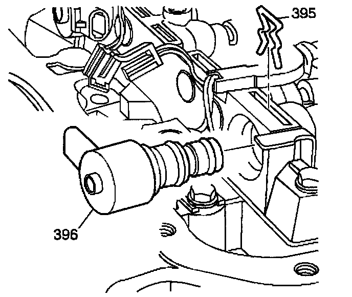 13. Install the TCC PWM solenoid valve (396) and the solenoid retainer (395).