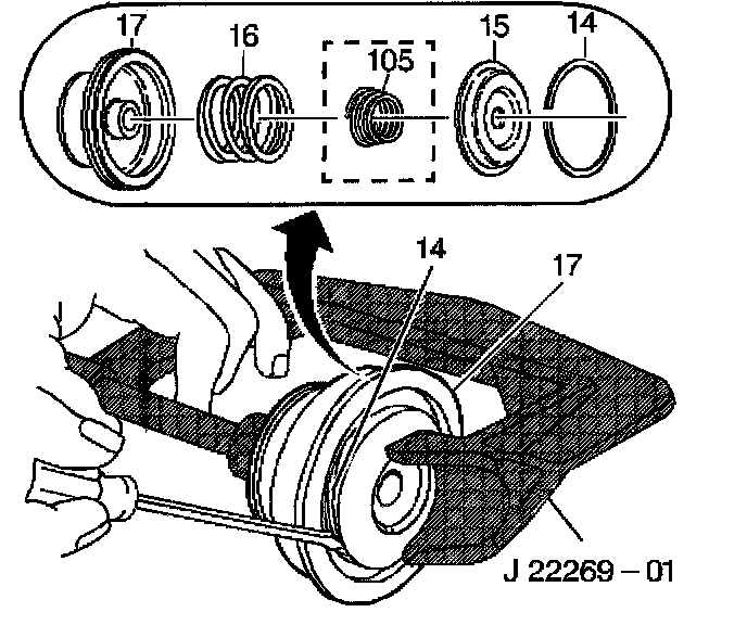 3. Remove the servo cushion spring retainer (15), the servo cushion outer spring (16) and the servo cushion inner spring (105) (model dependent).