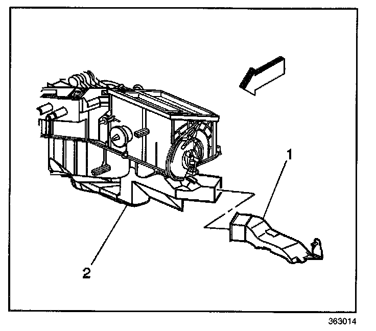 1. Remove the floor air outlet duct extension (1) from the floor duct (2).