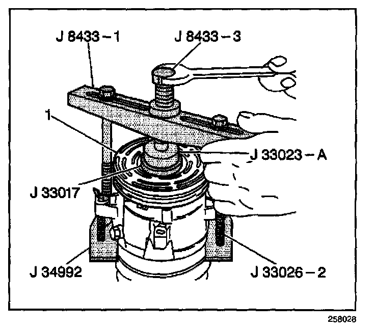 15. Tighten the center screw in the J 8433-1 in order to force the pulley rotor and bearing assembly onto the compressor front head.