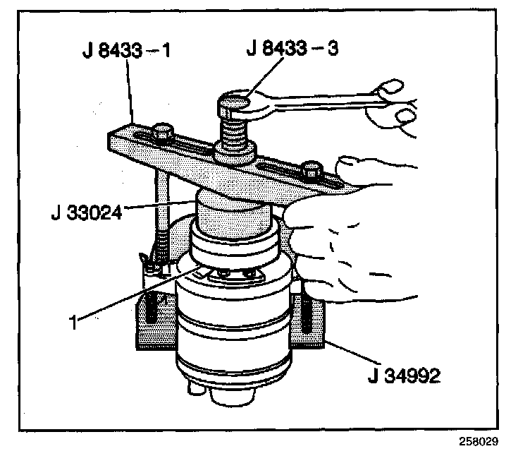 7. Turn the center forcing screw of the J 8433-1 in order to force the clutch coil onto the front head. Ensure that the clutch coil and the d 33024 remain aligned during installation.