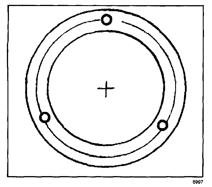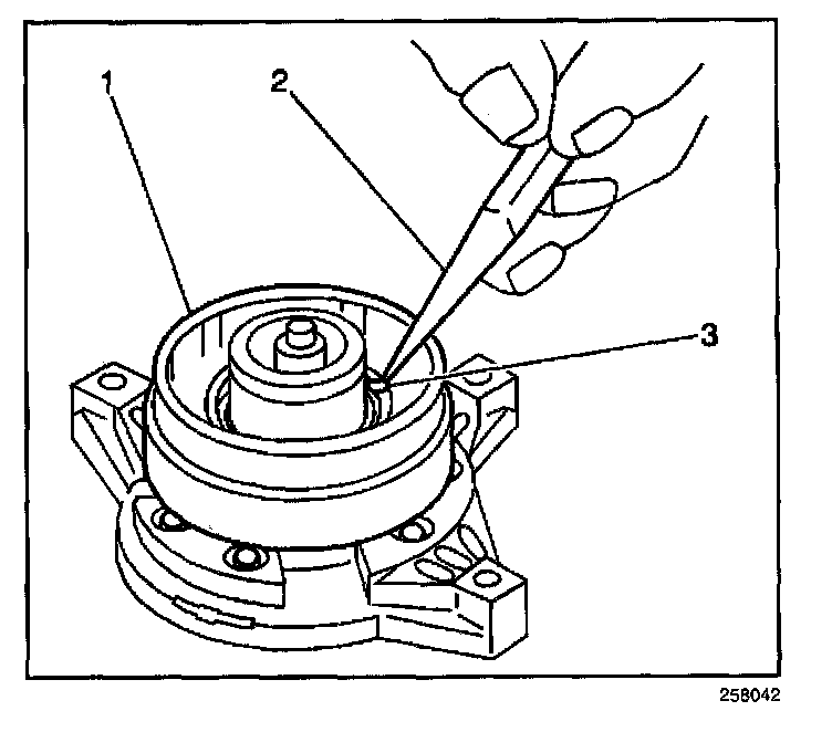 8. When the coil is fully seated on the front head, use a 1/8 inch diameter drift punch (2) in order to stake the front head at 3 places 120 degrees apart (3), in order to ensure that the clutch coil (1) remains in position.
