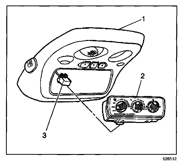 5. Remove the HVAC control assembly (2) from the console (1) by depressing the 4 tabs on the backside of the controller.