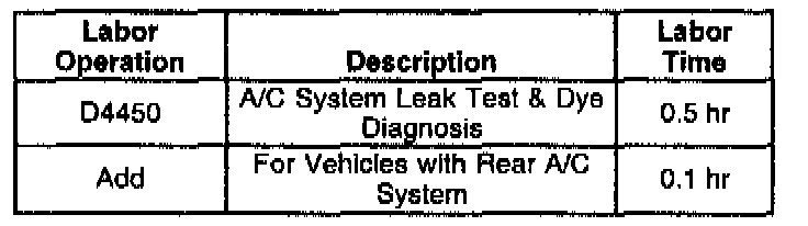 The leak dye mixes with the refrigerant lubrication (PAG oil). Therefore, extremely small leaks may be pressure, temperature or vibration sensitive and may not be active during the 5 minute test above. In this case, it may be necessary to request the vehicle be returned for further testing in 3 to 5 days. Vehicles which were driven in the rain, through sprinkler puddles, etc., may cause leak detection problems as the dye and the PAG oil are both water soluble.