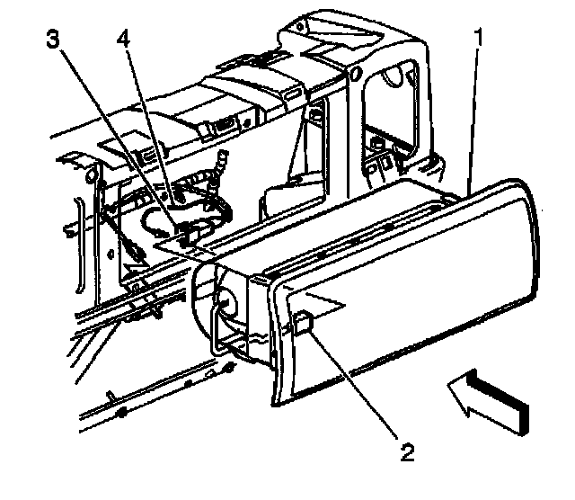 1. Install the inflatable restraint IP module (1) to the mounting bracket through the front of the instrument panel.