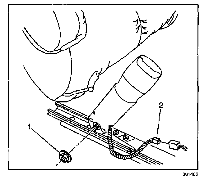 1. Remove the front seat belt buckle nut (1). Disconnect the electrical connection (2). The right seat buckle is shown, the left is similar.