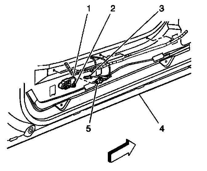 1. Connect the inflatable restraint side impact sensor yellow 2-way harness connector (5) to the inflatable restraint side impact sensor (1).