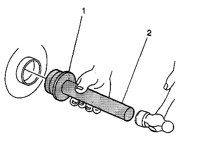 1. Install the axle shaft bearing using the J23690 (8.6 inch axle) (1) or the J 29709 (9.5 inch axle) (1) and the J 8092 (2).