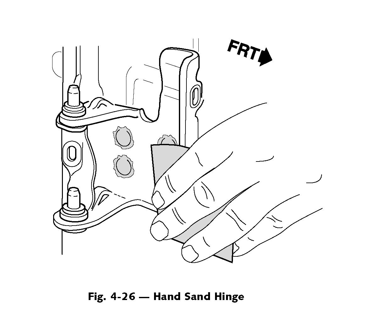 3. Lightly hand-sand the existing hinge with 100 grit or finer sandpaper in order to locate the 4 welds that attach the hinge to the pillar (Fig. 4-26).