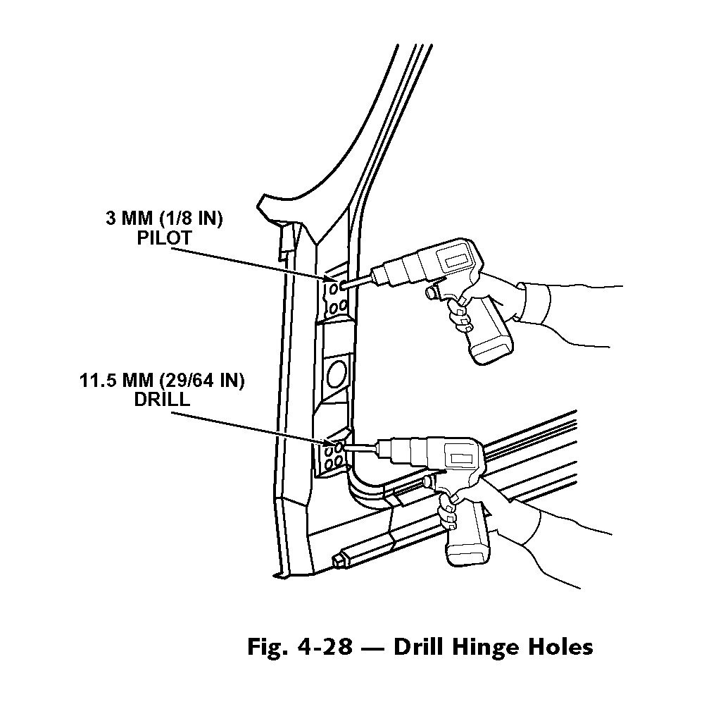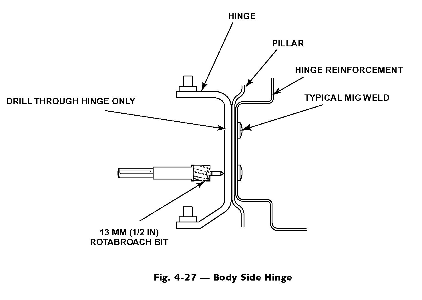 5. Drill through the hinge only, at each punch location. Use a 13 mm (1/2 in) rotabroach hole saw or equivalent (Fig. 4-27).