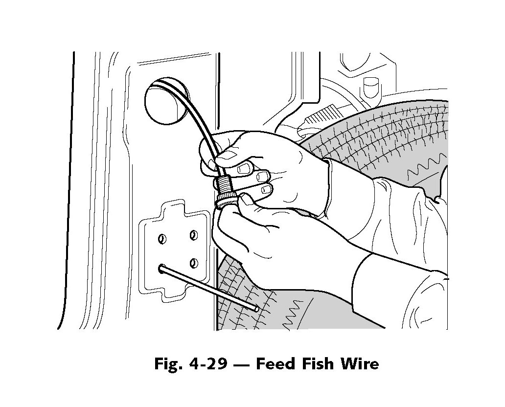 8. Feed fish wire, GM P/N 15017229 or the equivalent, through the hinge, the hinge stud hole and out of the conduit hole in the pillar (Fig. 4-29).