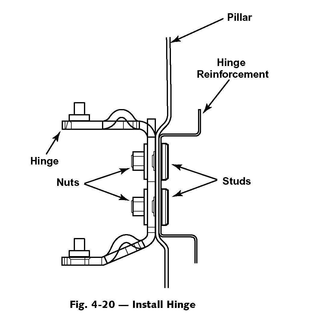 15. Install the hinge to the pillar. Use the supplied nuts. Torque the hinge to the pillar nuts to 25 N.m (20 ft lb.) (Fig. 4-30).