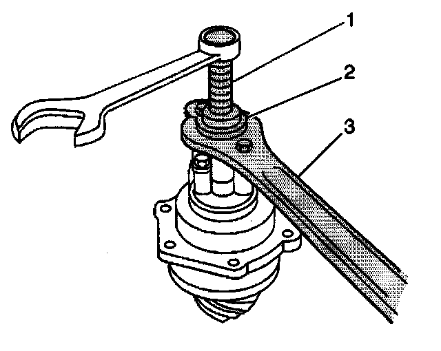 17. Remove the pinion yoke by turning the J 8614 3 (1) clockwise while holding the J 8614-01 (3).