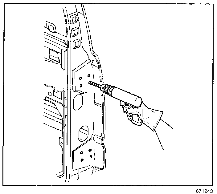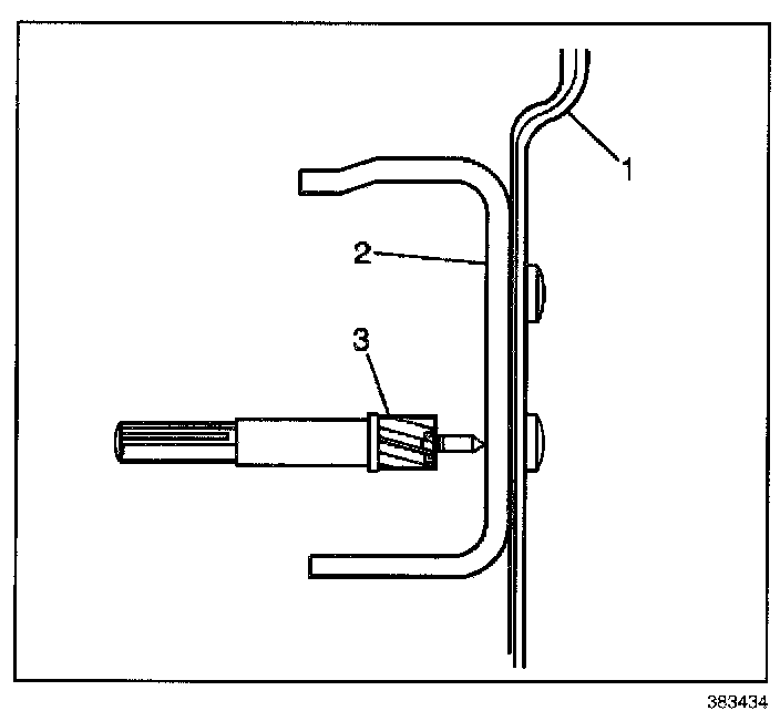 5. Drill through the hinge (2), at each punch location. Use a 13 mm (1/2 in) rotabroach hole saw (3) or equivalent.