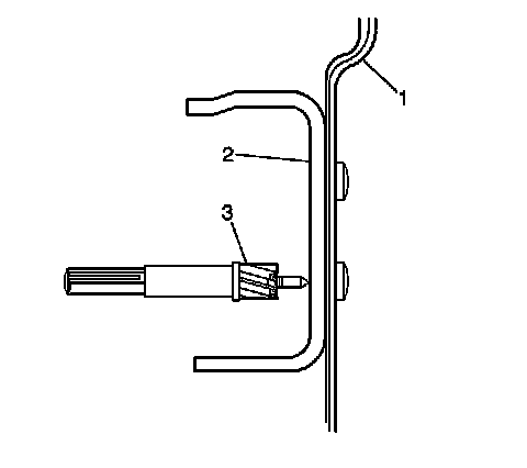 5. Drill through the hinge (2), at each punch location. Use a 13 mm (1/2 in) rotabroach hole saw (3) or equivalent.