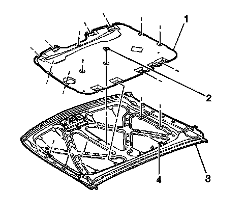 1. Position the insulator (1) to the rear hood (3) and fold at the center to position under the front holding tabs (4).
