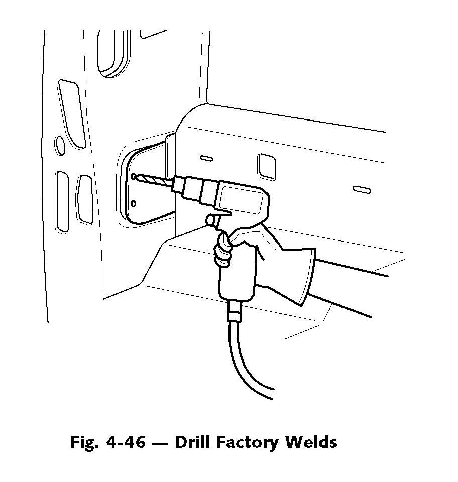 5. Locate and drill out all necessary factory welds in the hinge access panel. (Fig. 4-46).