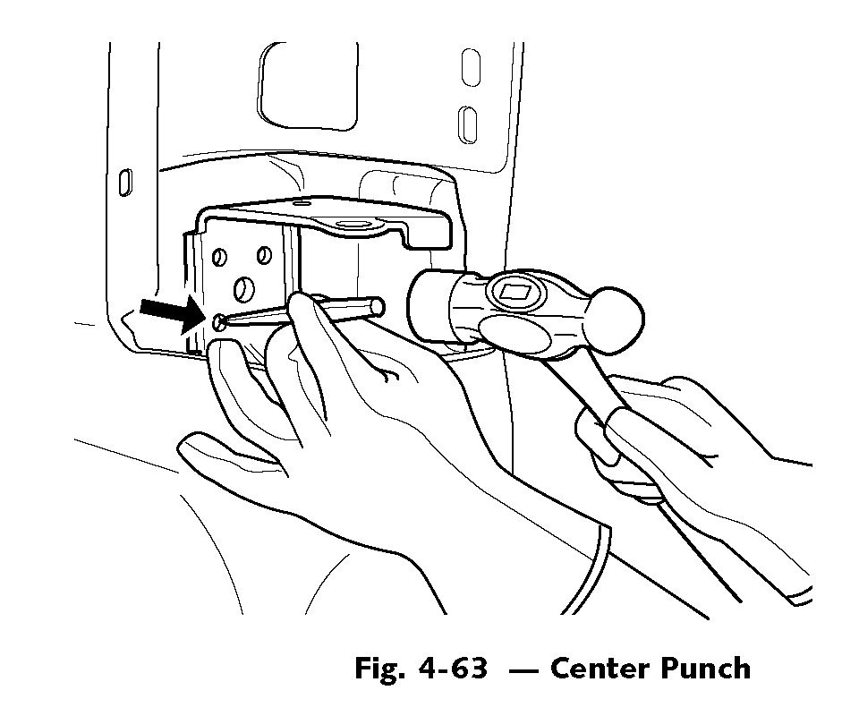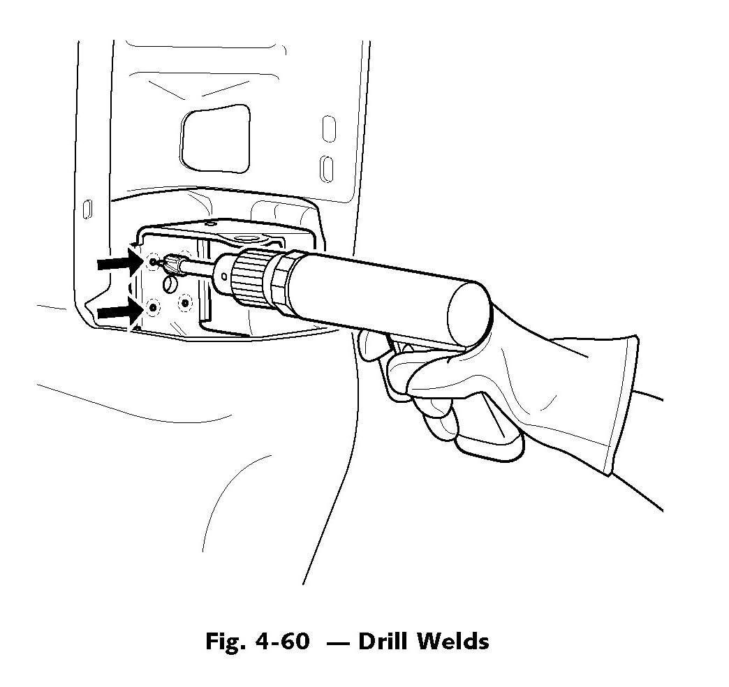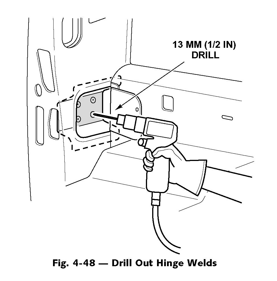 7. Locate and drill the center of the hinge welds using a 13 mm (1/2 in) drill bit or the equivalent (Fig. 4-48).