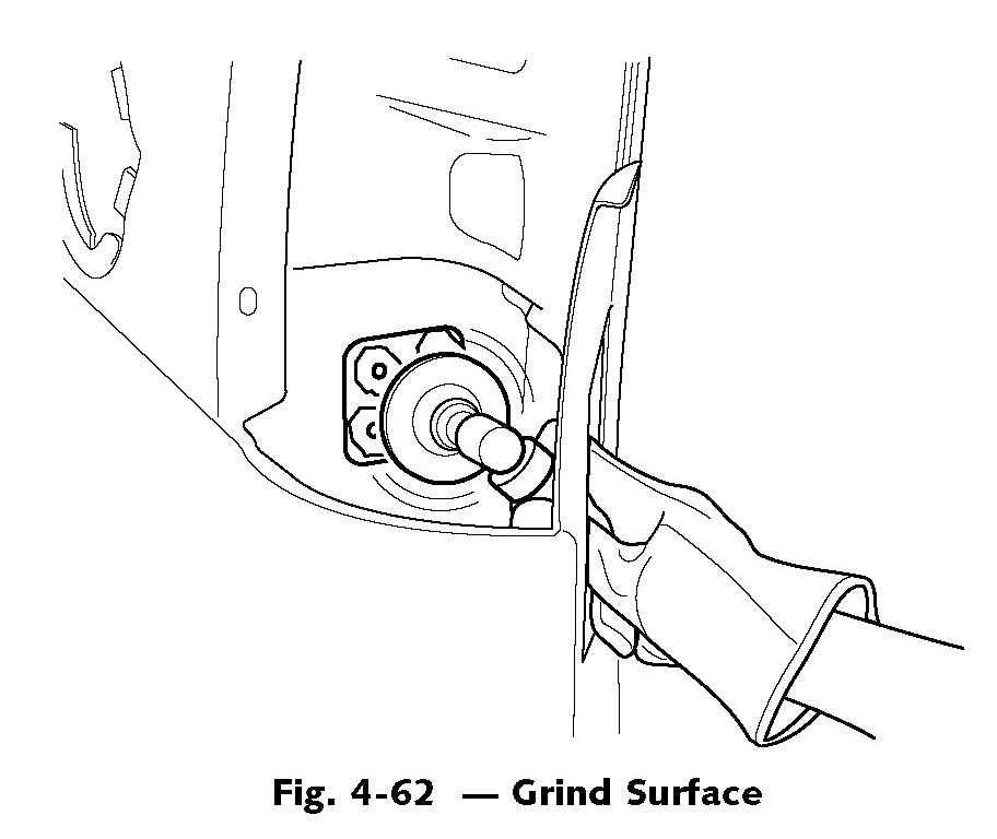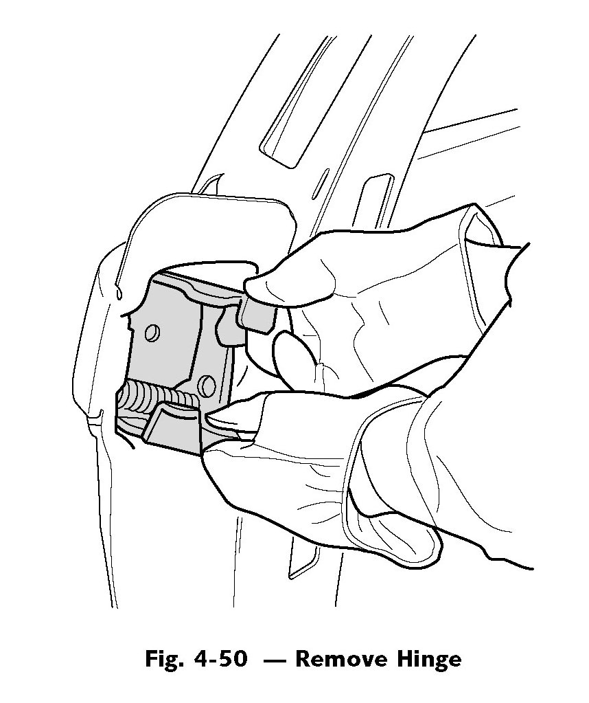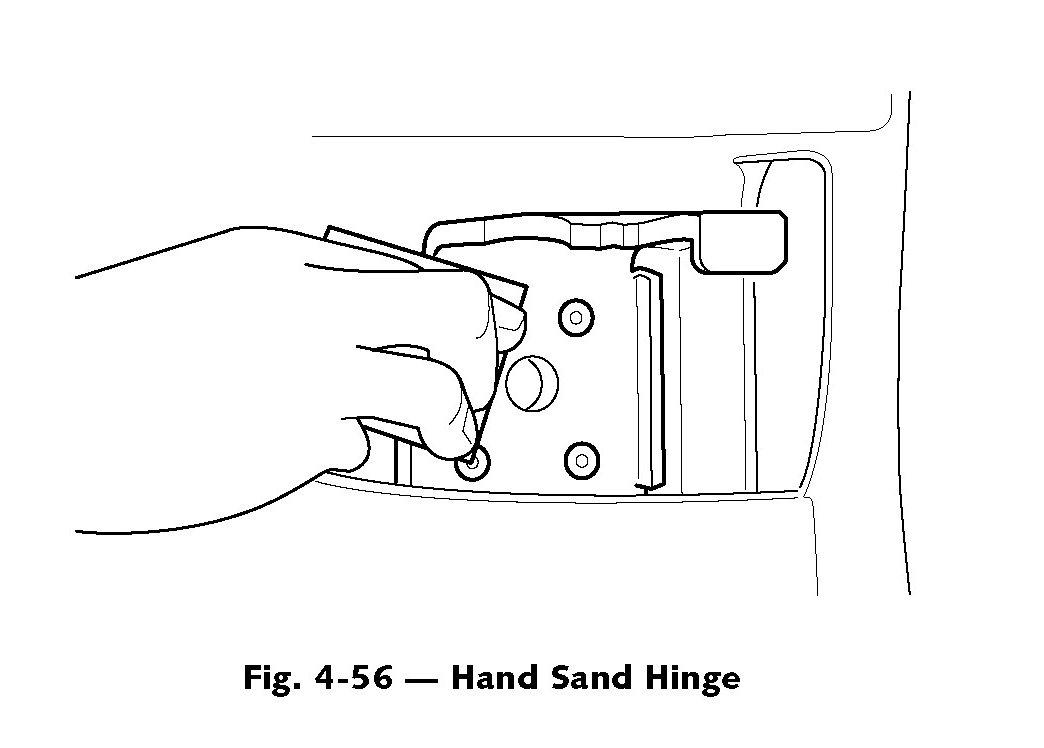 5. Lightly hand-sand the existing hinge with 100 grit or finer sandpaper in order to locate the 4 welds that attach the hinge to the pillar (Fig. 4-56).