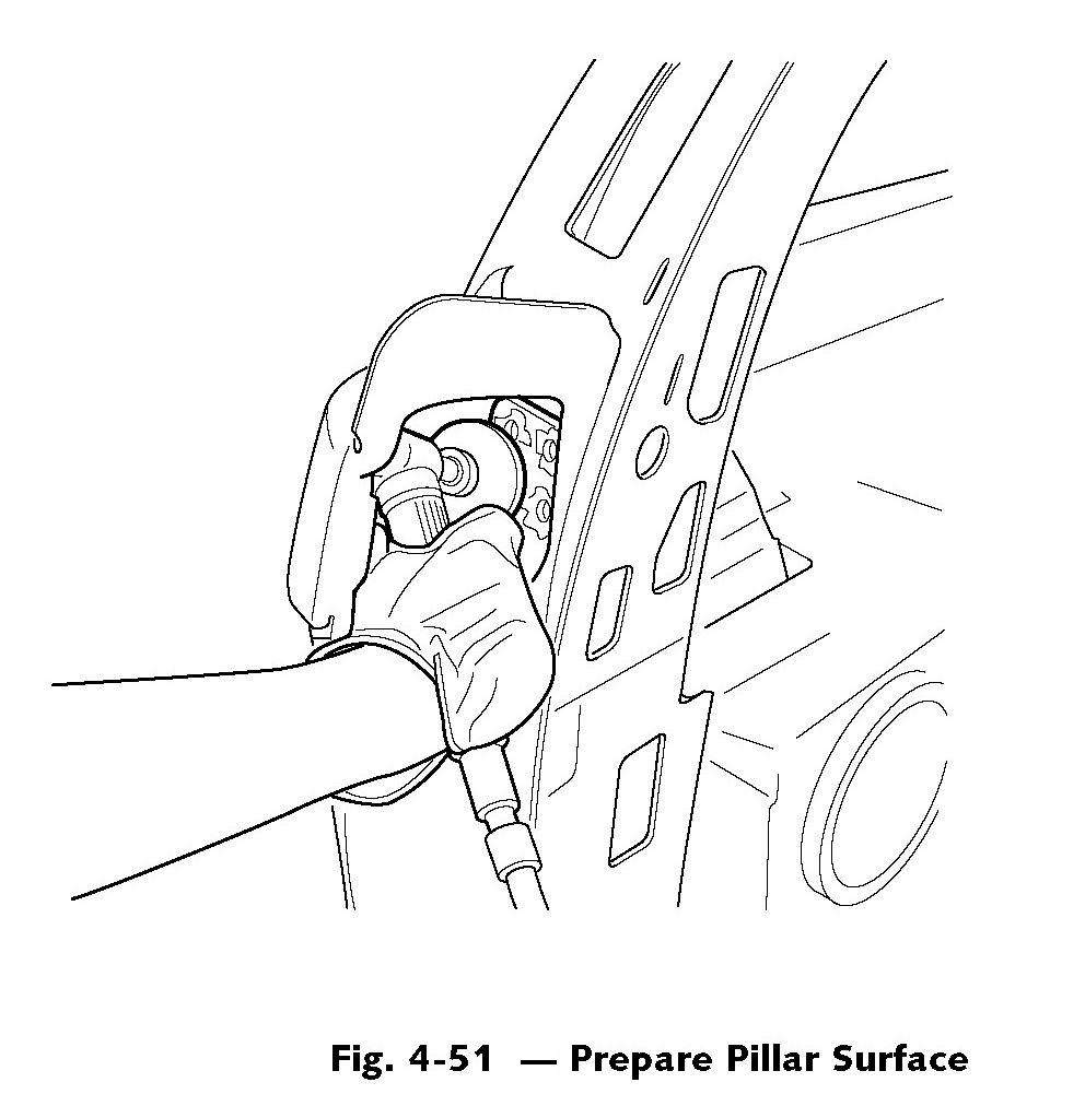 1. Clean and prepare the pillar surface in order to ensure a flush fit of the service hinge and the fasteners (Fig. 4-51).
