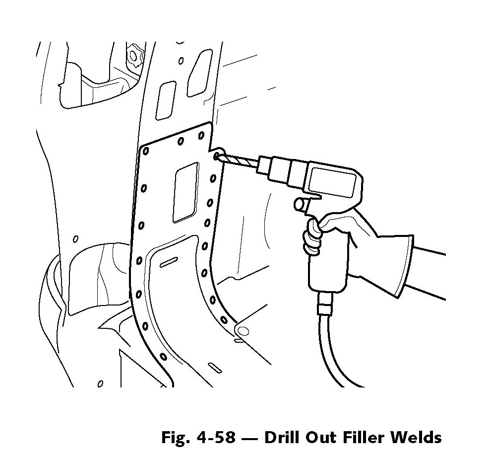 7. Locate and drill out all necessary factory welds in the rear body opening lower filler, using 8 mm (5/16 in) spot weld remover, to gain access to the backside of the lower hinge (Fig. 4-58).