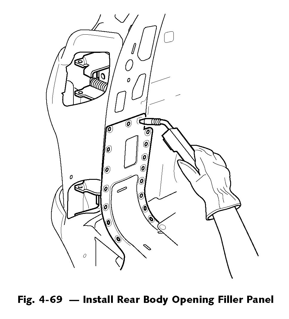 12. Position the rear body opening lower filler and mig-weld in place at factory weld locations (Fig. 4-69).