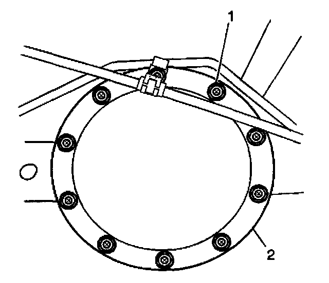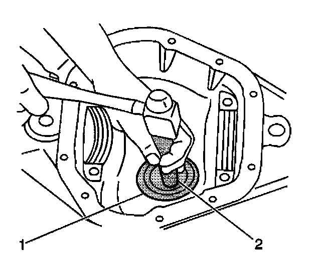 1. Install the outer pinion bearing cup using the J 8608 (1) and the J 8092 (2).