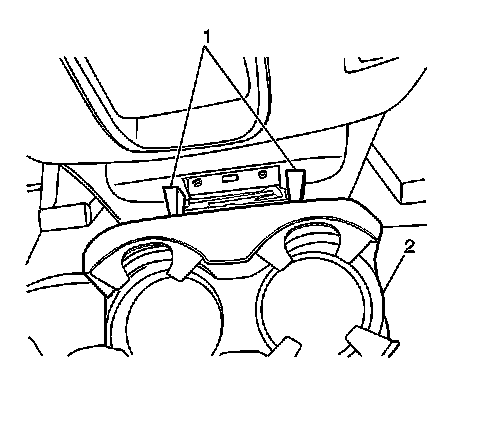 2. Remove the tabs (1) that connect the cupholder to the floor console by gently prying apart with a flat bladed tool.