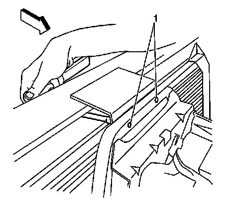 8. Remove the tie bar to radiator brace bolts (1). Access the bolts from the rear of the upper radiator support using an extension.