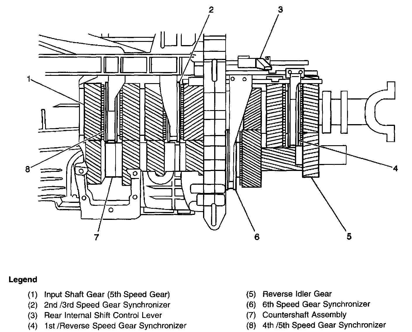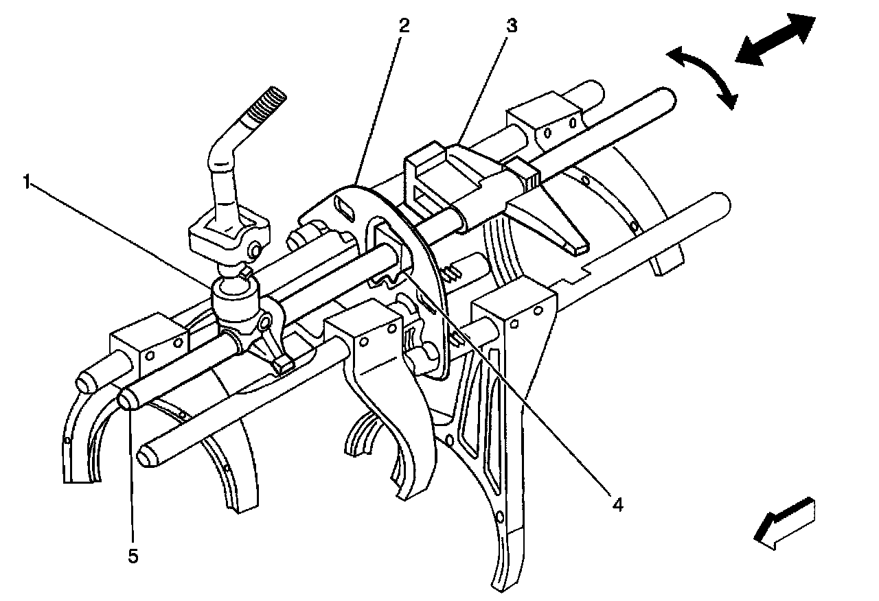 The shift lever moving the main shift shaft (5) selects the transmission speeds. By moving the main shift shaft front-to-rear and side-to-side rotation will allow the levers on the front internal shift control lever (1) to engage the notches on the 4th/5th speed gears shift shaft or the 2nd/3rd speed gears shift shaft. Further movement of the main shift shaft front-to-rear and side-to-side rotation, the levers on the rear internal shift control lever (3) will engage in the notches on the reverse/1st speed gears shift shaft or the 6th speed gear shift shaft. The shift shaft block (4) on the main shift shaft, which is teeth to the interlock plate (2), moves the interlock plate to lock in the notches on the non-selected gears shift shaft, thus preventing the non-selected shift shafts from moving.