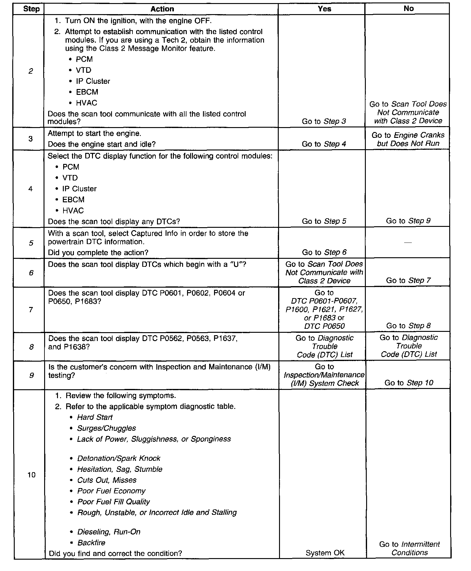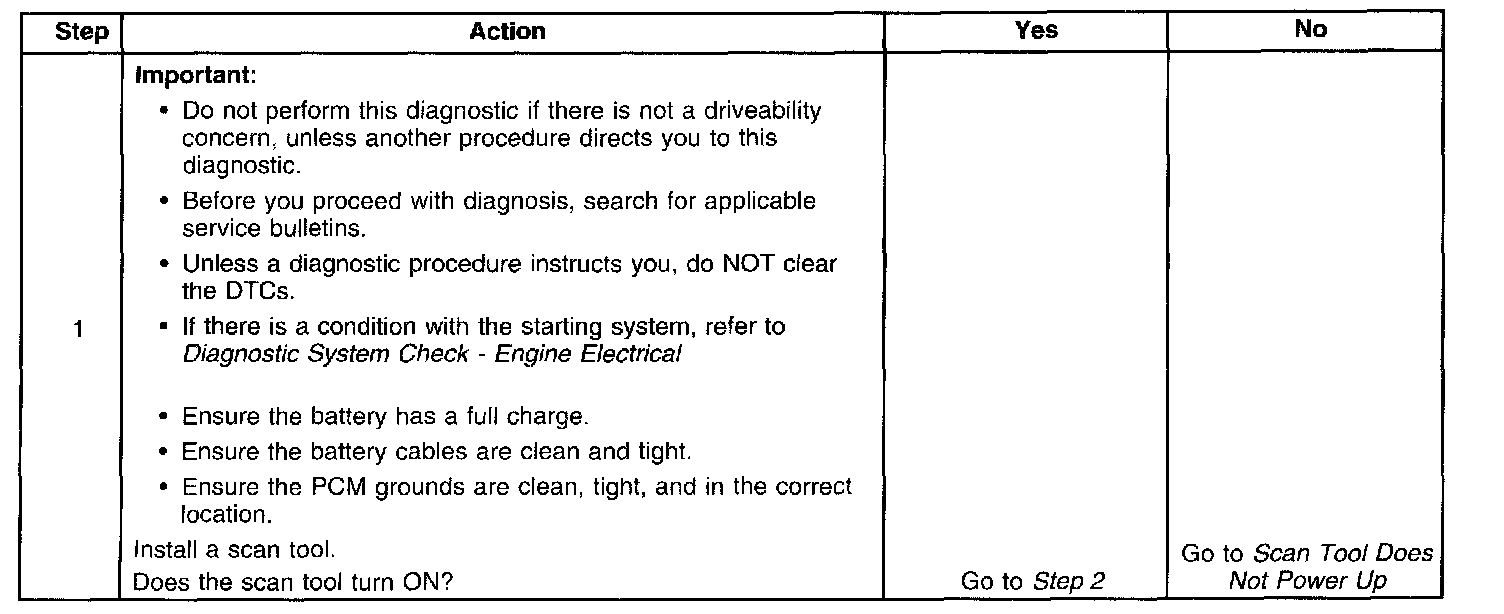 The Diagnostic System Check is an organized approach to identifying a condition that is created by a malfunction in the electronic engine control system. The Diagnostic System Check must be the starting point for any driveability concern. The Diagnostic System Check directs the service technician to the next logical step in order to diagnose the concern. Understanding, and correctly using the diagnostic table reduces diagnostic time, and prevents the replacement of good parts.