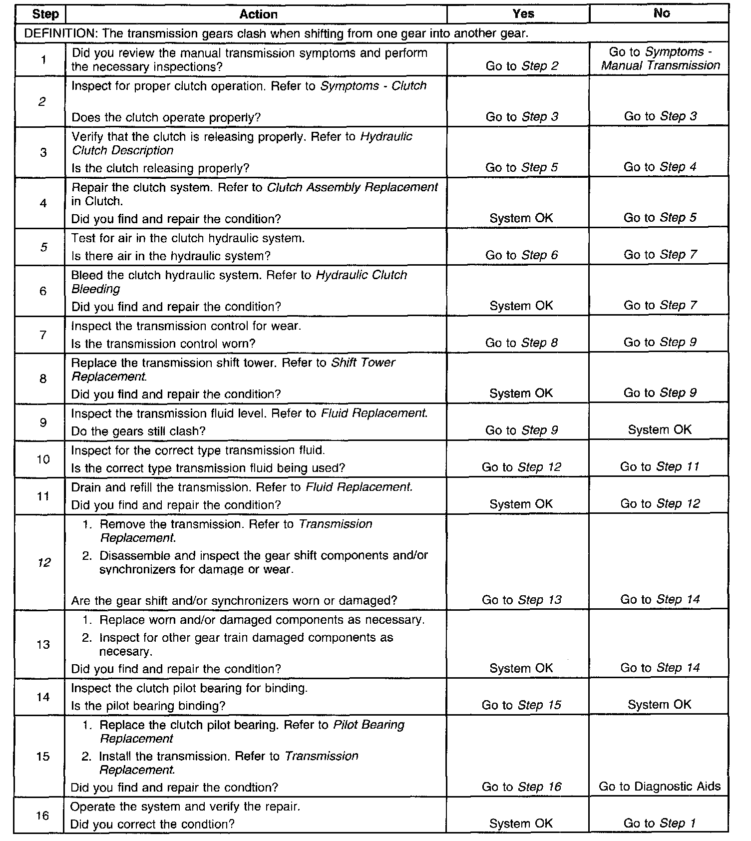 Gear clash is a grinding noise that is made when shifting gears. You should also perform a static shift and dynamic shift test. If the transmission develops gear clash, first check the clutch adjustment or faulty clutch condition. A clutch that drags or does not fully engage is the most common cause of gear clash. If the clutch is at fault, the clash should occur in every gear. If the clutch is all right, or the clash does not occur in all gears, remove the transmission and check for worn or damaged synchronizers, including the sleeves, hubs and the blocking rings. Also check for loose mounting bolts or misalignment.