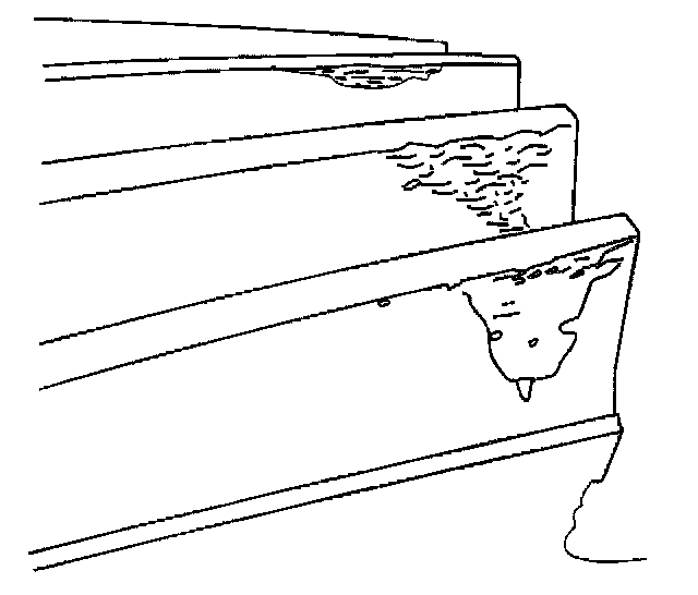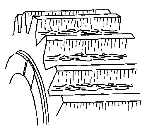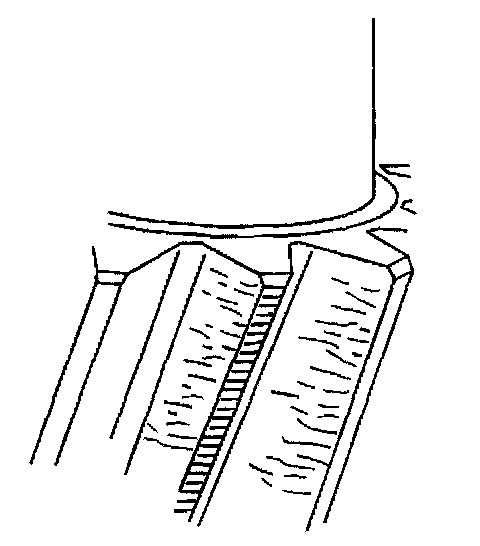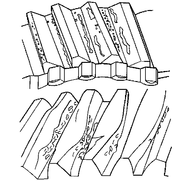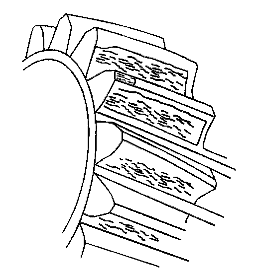 This type of damage occurs on the roller races of the idler gears. This type of damage is characterized by what appears to be the impression of the bearing rollers. If the bearing only performs a supporting function over a long period of time, there is not movement between the gear and the supporting shaft, the bearing contact areas may show signs of fretting corrosion.