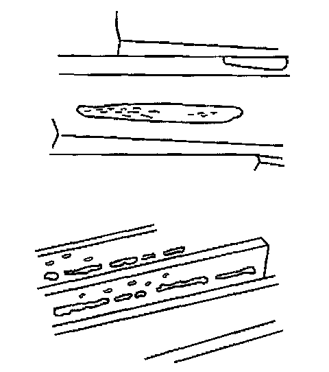 Brownish red to black spots, sometimes with local material loss on the flank. If corrosion has not caused material loss to the flank the sliding and rolling action of the flank can help to remove some of the corrosion.