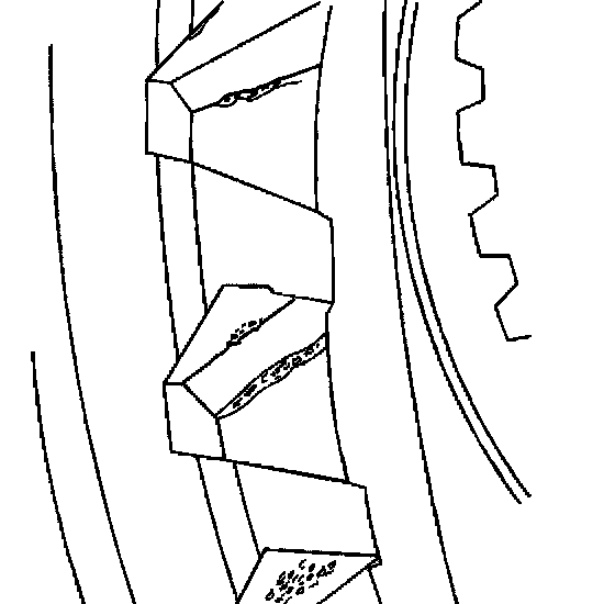 This is a typical type of gear damage. Indentations occur in the circulative face, spaced the same as the roller bodies. This kind of damage only affects the race-shaft and gear-bore-race of the selected gear. Affected areas can be identified on the roller bodies. This kind of gear damage is serious due to the very high increase in radial play on helical-cut gears. This can result in contact pattern displacement on the mating gears and can even cause tooth failure.