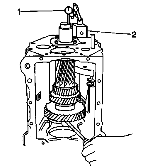 11.1. Using a magnetic indicator base J26900-13 (2) set the dial indicator J 8001 (1) on the end of the countershaft.