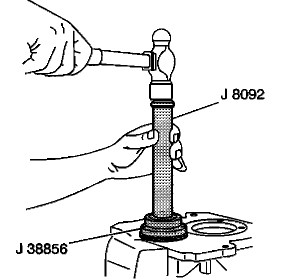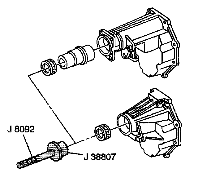 39. (RWD models) Using J38807 and J8092, install the rear output shaft rear bearing in the transmission extension.