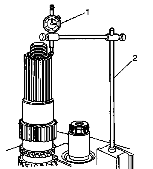 23.1. Using a magnetic indicator base J 26900-13 (2) set the dial indicator J 8001 (1) on the end of the mainshaft.