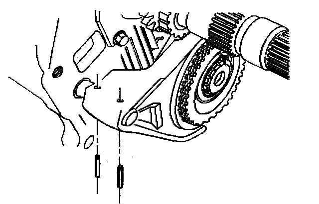 29. Install the overdrive speed gear shift fork roll pins. Support the fork and drive the roll pins downward from the top of the fork.