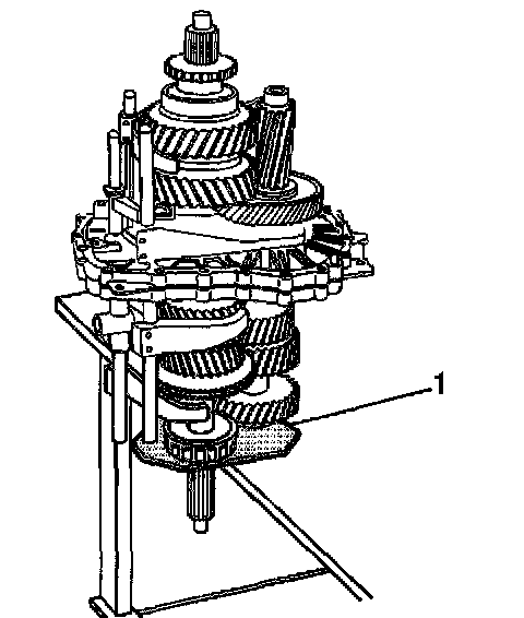 35. Using the J 44730 (2) and the J 44707 (1) on the countershaft, remove the 6th gear synchronizer hub and 6th gear bushing.