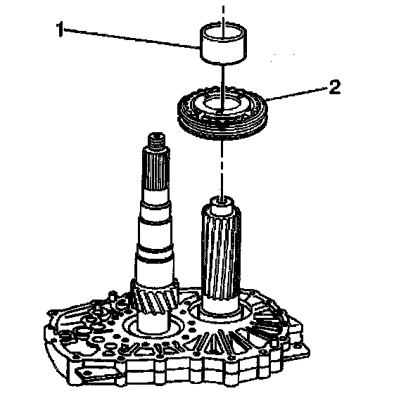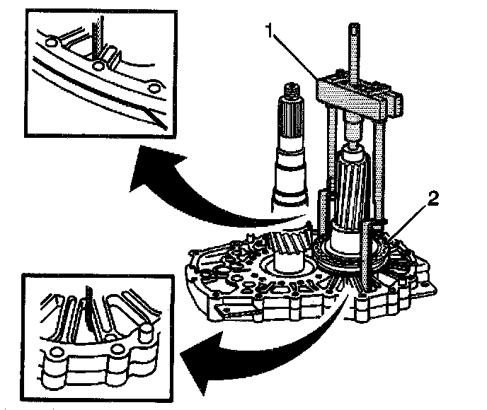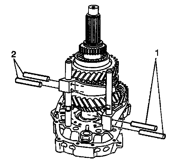 34. Install the J 44730 (2) on the intermediate case as shown. The J 44730 needs to be aligned in order for the J 44707 to be centered on the mainshaft.