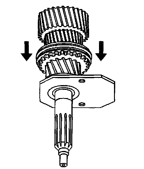 Important: The input shaft is not secured to the mainshaft assembly. In order to prevent the lost of synchronizer springs and pressure pieces, shift the 4th/5th synchronizer sleeve to 5th gear before removing from the J 44725. Moving the synchronizer in 5th gear will lock the input shaft with the mainshaft.