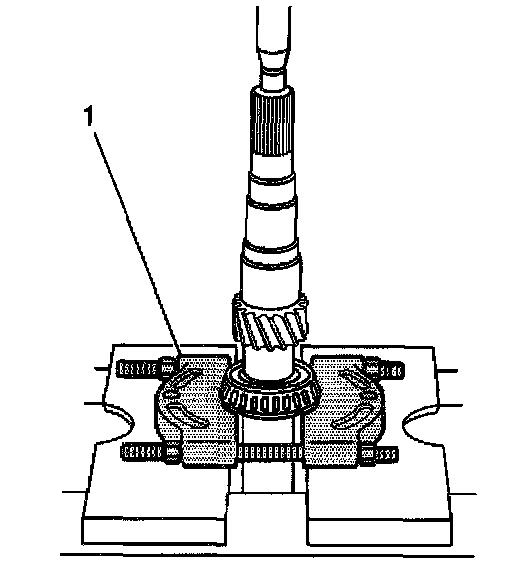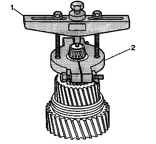 5. Install the J22912-01 (2) under the main shaft front bearing. Ensure the J22912-01 is not pressing against the bearing cage.