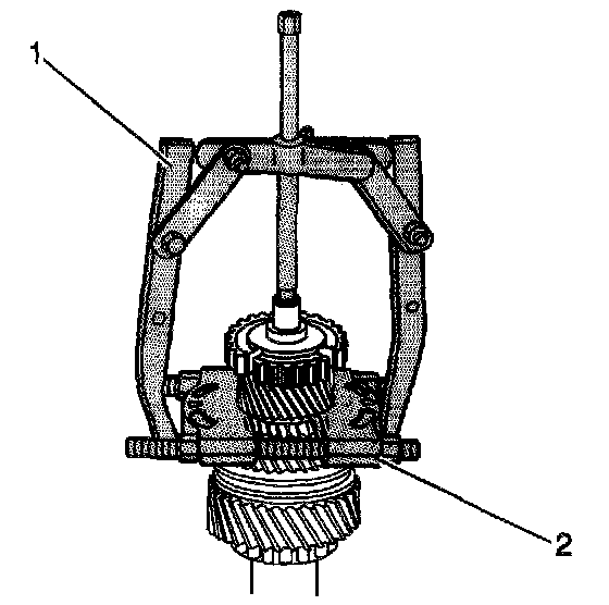 13. Remove the 4th/5th synchronizer hub using the J 44726 (1) and the J 44749 (2).