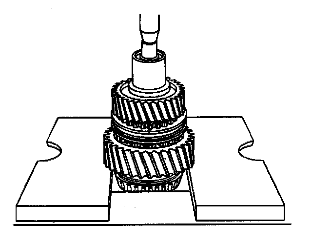 18. Use a hydraulic press to remove the 4th gear bushing, 3rd gear bushing, and the 2nd/3rd synchronizer hub and the related parts listed in the next step. Install the press plates under the 2nd gear.